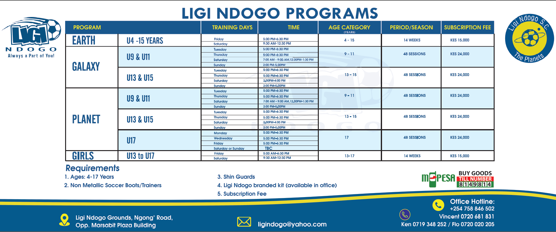 Parent/ guardian declaration I, (parent/ guardian) of the above named child agree that the registrant and I will abide by the Ligi Ndogo Rules & Regulations, regarding the possibilities of physical injury associated with training/ playing. I hereby indemnify Ligi Ndogo, it's sponsors & facilities used for this program against any claims by or on behalf of the registrant as a result of the child's participation in the Ligi Ndogo programs & games.